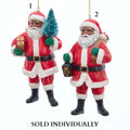 These African American Santa ornaments from Kurt Adler are a wonderful addition to any holiday décor or Christmas tree. Included in this assortment are two Santa ornaments, once Santa is holding a miniature snowy bottle brush Christmas tree and a decorated present and the other Santa is holding a lantern.