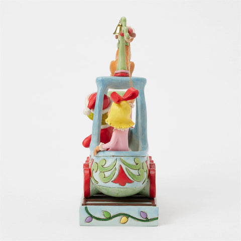 All aboard the Grinchy Express! In this charming Jim Shore creation, The Grinch steers a train engine adorned with delightful floral rosemaling. Max rides on top while Cindy Lou rings a real bell, bringing Seuss's classic tale to life with sound!