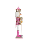This Kurt Adler Wooden Pink Nutcracker's is accented with pink and gold sequins, a silver staff and gem adorned crown.