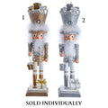 Hollywood Nutcrackers™ is a whimsical collection of nutcrackers created exclusively for Kurt S. Adler, Inc. and features an assortment of designs that put a unique, vibrant, memorable twist on traditional nutcrackers. These 18-inch silver and gold King Nutcrackers feature a gold or silver glittered outfit with matching hat and base. Each nutcracker is decorated with clear gemstones and white pearls and is carrying a present on one hand.