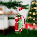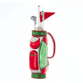 This glittered golf club and bag ornament from Kurt Adler is a festive addition to your Christmas tree. It features silver glittered golf clubs in a red, white and green glittered golf bag with a red flag.