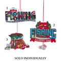 These fishing ornaments from Kurt Adler are a fun and festive addition to any holiday décor or Christmas tree. This assortment features three holiday fishing ornaments. Made of resin.