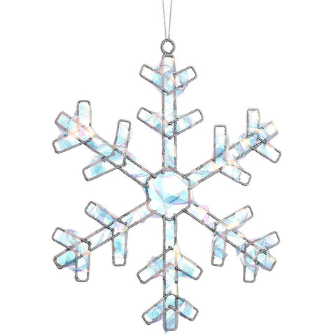 Add a touch of winter magic to your holiday decor with this 11" Snowflake Ornament. Crafted from durable metal and plastic, its clear and iridescent design catches the light beautifully, adding sparkling elegance to your tree or festive display. Perfect for creating a memorable seasonal atmosphere that delights every guest.