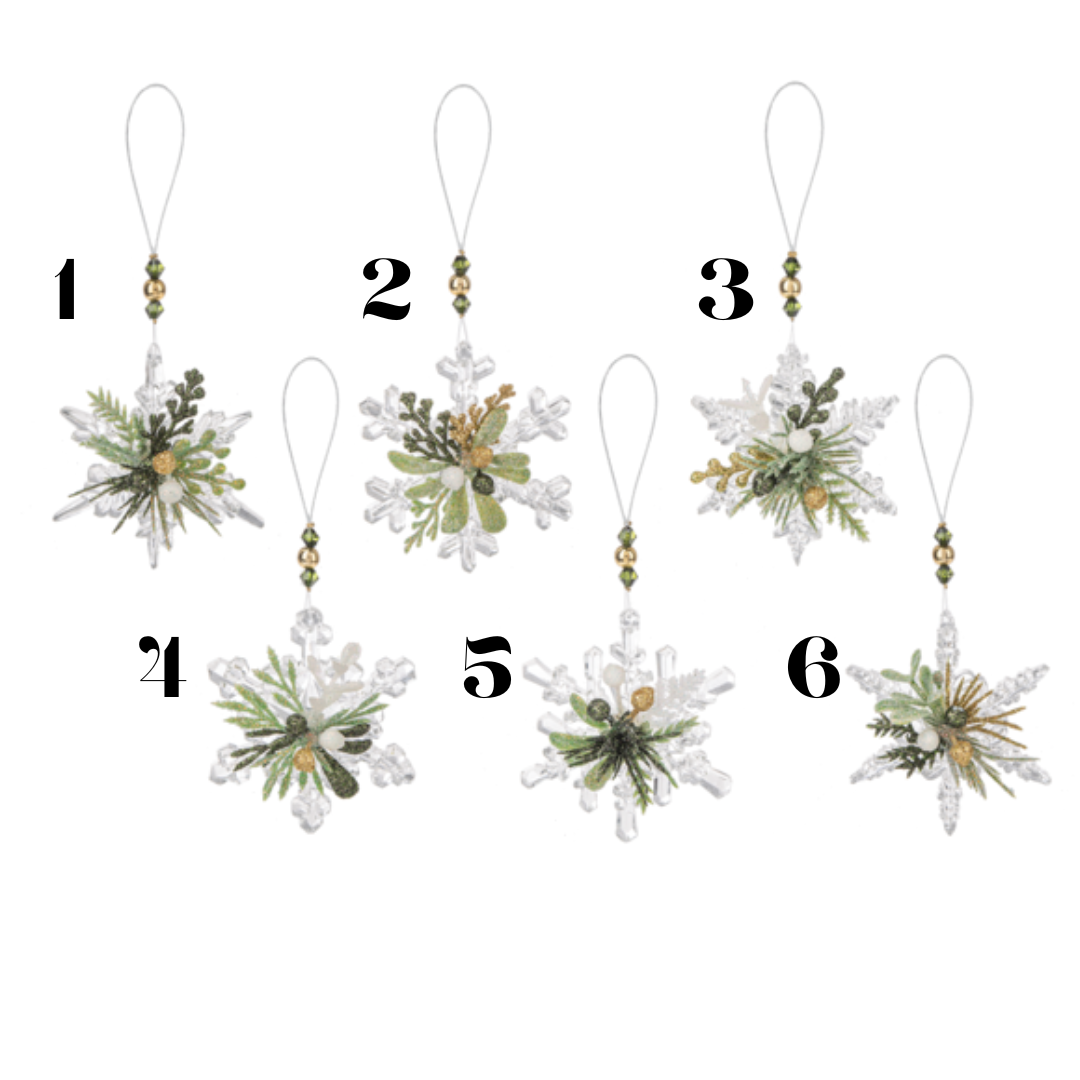Charming in their size, these snowflake ornaments adorned with sage jewels and glitter mistletoe are the perfect pint-sized addition to your tree this holiday season. Available in 6 different options.