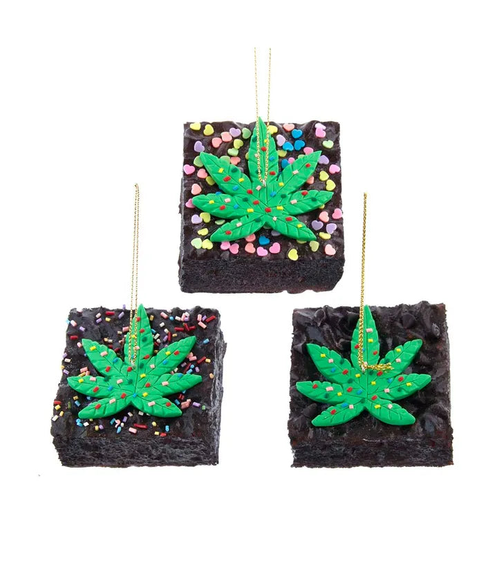 These cannabis brownie ornaments from Kurt Adler are a fun ad unique addition to your holiday décor or Christmas tree. Included in this assortment are three brownie ornaments decorated with a green cannabis leaf. Each brownie has multicolor sprinkles, chocolate chips or multicolor heart shaped sprinkles.