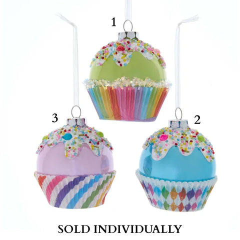 Add a sweet touch to your holiday décor with Kurt Adler's glass cupcake ornaments. This assortment features a green, pink and blue cupcake topped with white icing and multi-colored bead sprinkles.
