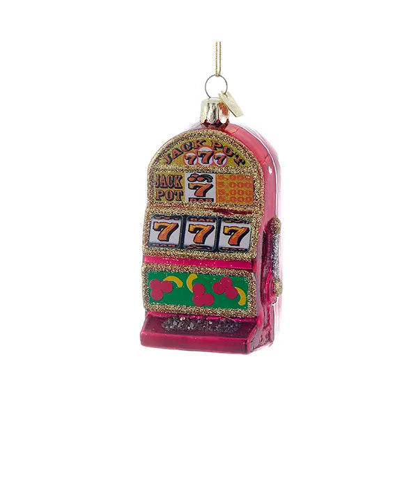 This Noble Gems™ slot machine ornament from Kurt Adler is a fun, unique addition to any holiday décor or Christmas tree. This ornament features a shiny red slot machine adorned with bright glitter at the handle and framing the front images. Complete with "Jack Pot" and the numbers "777" on the front and glitter gathered at the bottom to represent jackpot winnings.