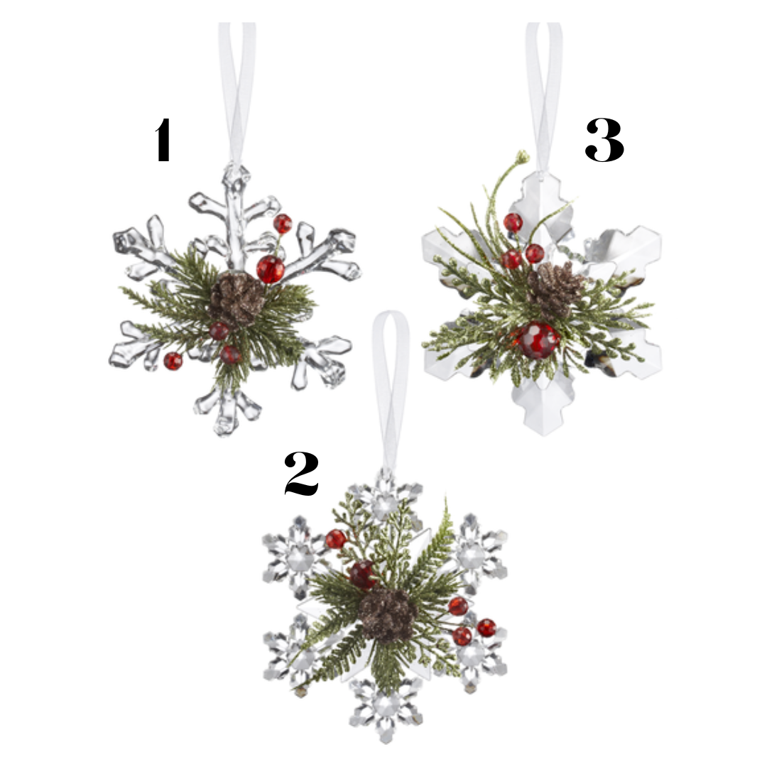 Whimsical and sweet, these crystal snowflake ornaments feature green and red glittering holly details with pinecones. Available in three different styles.