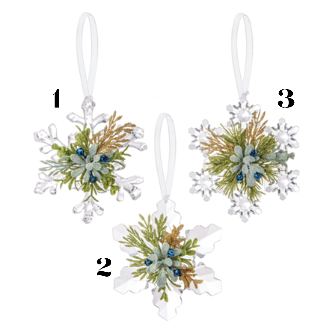 Delicate and delightful, these mistletoe snowflake ornaments are a charming addition to any Christmas tree. Available in three different styles.