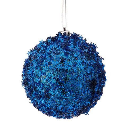 Add a bold and vibrant touch to your holiday decor with this 4-inch Metallic Snowflake Ball Ornament in blue. Covered in shimmering blue snowflake sequins, this ornament brings a striking pop of color and a festive sparkle to your Christmas tree. The deep blue hue creates a cool and elegant atmosphere, making it a perfect addition to any holiday setting that aims to dazzle and impress.