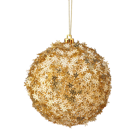 Add a festive touch to your holiday decor with this 4-inch Metallic Snowflake Ball Ornament in gold color. Featuring shimmering gold-colored snowflake sequins, this ornament brings a warm and elegant sparkle to your Christmas tree. Its bright, reflective finish is perfect for adding a touch of glamour to your seasonal decorations.