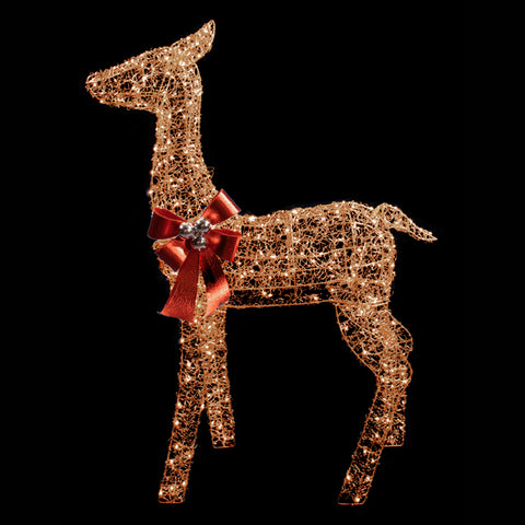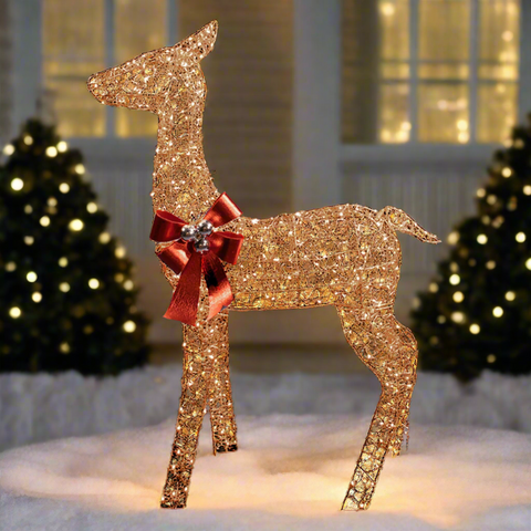- 43 inch lighted gold wire doe which includes a red bow with gold glitter swirls and silver balls