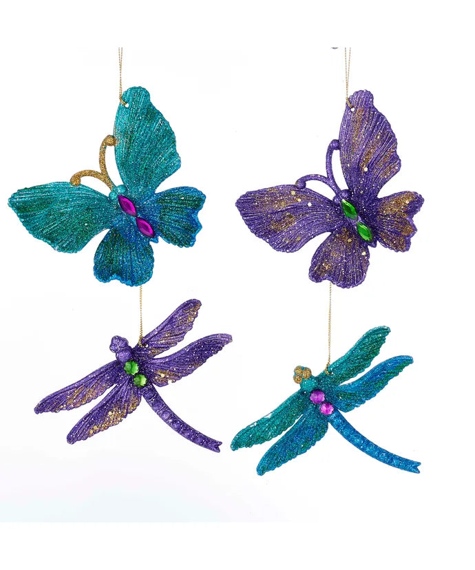 These peacock inspired butterfly and dragonfly ornaments from Kurt Adler are a unique addition to any home or holiday décor. This assortment includes two butterflies and two dragonflies in blue, green and purple glitter with gold glitter accents and purple and green gem stone bodies.