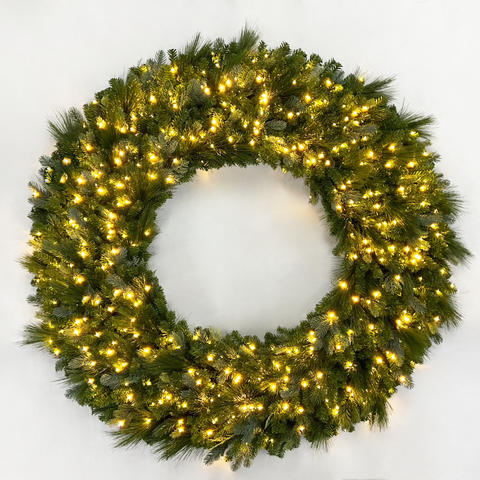Elevate your holiday décor with this 60" American Mixed Greenery Wreath, featuring a lush blend of diverse greenery for a natural and full appearance. Adorned with 450 warm white LED bulbs across 1532 tips, it offers a radiant glow that creates a festive atmosphere indoors or outdoors. Its generous size and vibrant illumination make it a captivating centerpiece that welcomes guests with timeless holiday cheer.
