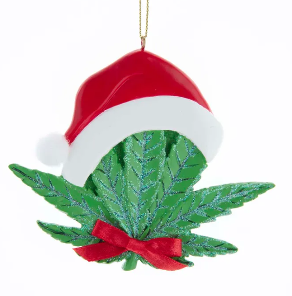 This glittered cannabis leaf ornament for personalization is a fun and unique addition to your holiday décor or Christmas tree. It features a glitter accented cannabis leaf with a red and white Santa hat and red bow.