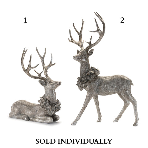 Add a touch of holiday cheer to your home with our Deer w/Wreath figurine. Available in two styles - standing and lying down - this silver resin deer is the perfect addition to your festive decorations. Measuring 15"L x 19"H and 17.5"L x 27.5"H, it's the ideal size to add a touch of elegance to any room.