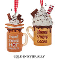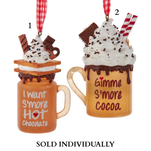 Kurt Adler's fancy hot chocolate s'mores ornaments are a sweet addition to any holiday décor or Christmas tree. Included in this assortment is a mug of hot chocolate topped with a s'more and the saying "I Want S'more Hot Chocolate" and a mug of hot chocolate topped with a s'more and whipped cream and the saying "Gimme S'more Cocoa."
