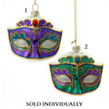 These glass peacock inspired mask ornaments from Kurt Adler are a festive addition to any holiday décor or Christmas tree. This assortment features a glass teal mask with purple and gold glittered accents and a glass purple mask with teal and gold glittered accents.