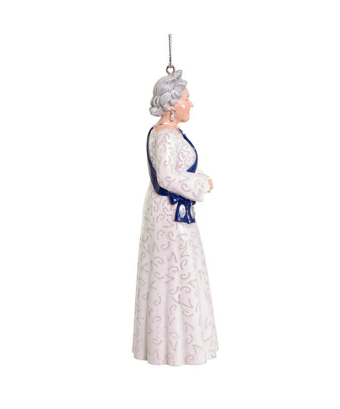 This Queen Elizabeth ornament from Kurt Adler is a fun addition to your holiday décor or Christmas tree. Paying homage to our closet ally The Queen is wearing a white gown, blue sash and a jeweled tiara.