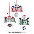 These sports ornaments from Kurt Adler are the perfect way to honor the athlete in your family. This assortment includes "Touchdown MVP Football" with a football dangle, "Homerun MVP Baseball" with a baseball dangle and "Goal MVP Soccer" with a soccer ball dangle. Each of these ornaments also includes a jersey and accessories. Choose from one of three styles.
