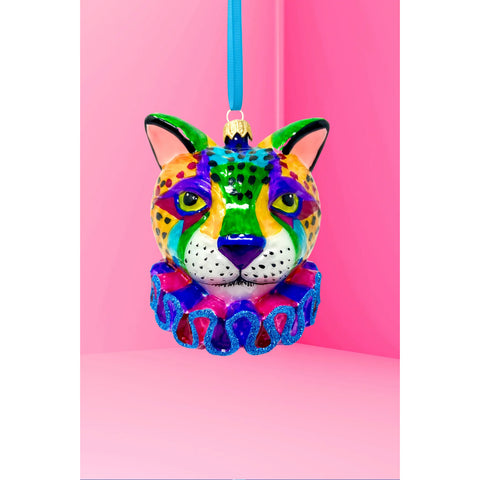 Drenched in dazzling technicolor, this hand-painted cheetah embodies both power and playfulness. Its piercing green eyes and shimmering ruffled collar add a regal touch, turning this ornament into a statement piece for those who embrace the extraordinary.